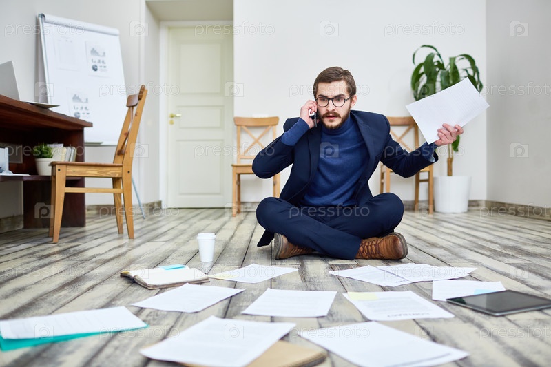Взволнованный бизнесмен, работающий на полу в офисе