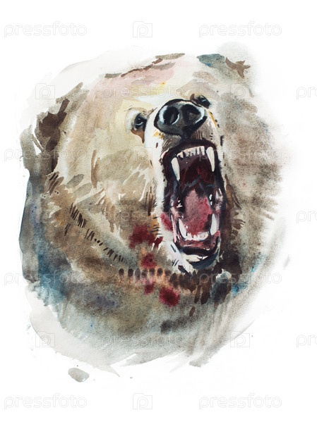 Акварельный рисунок сердитого медведя. Портрет животных на белом фоне
