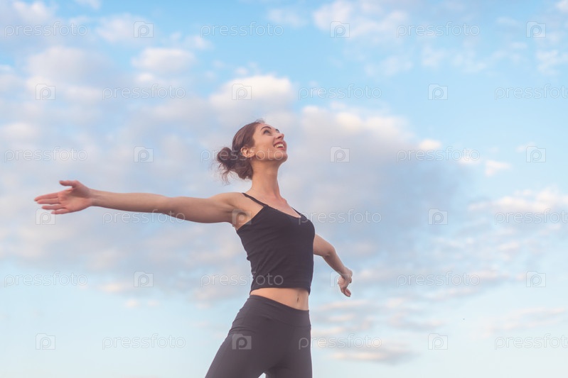 Женщина, наслаждаясь закатом с распростертыми объятиями