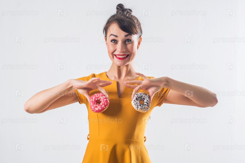 Молодая смешная брюнетка с пончиками