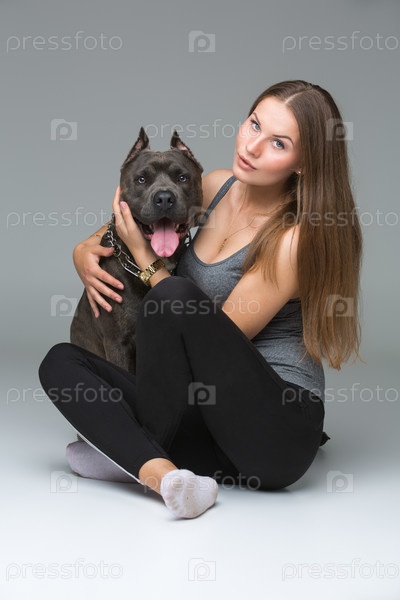 Красивая девушка с серым американским стафф терьером