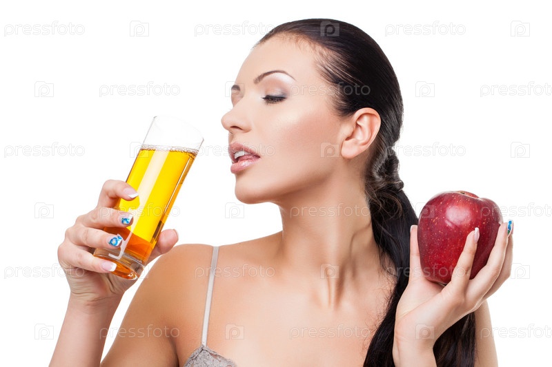 Красивая девушка с яблоком и стаканом сока