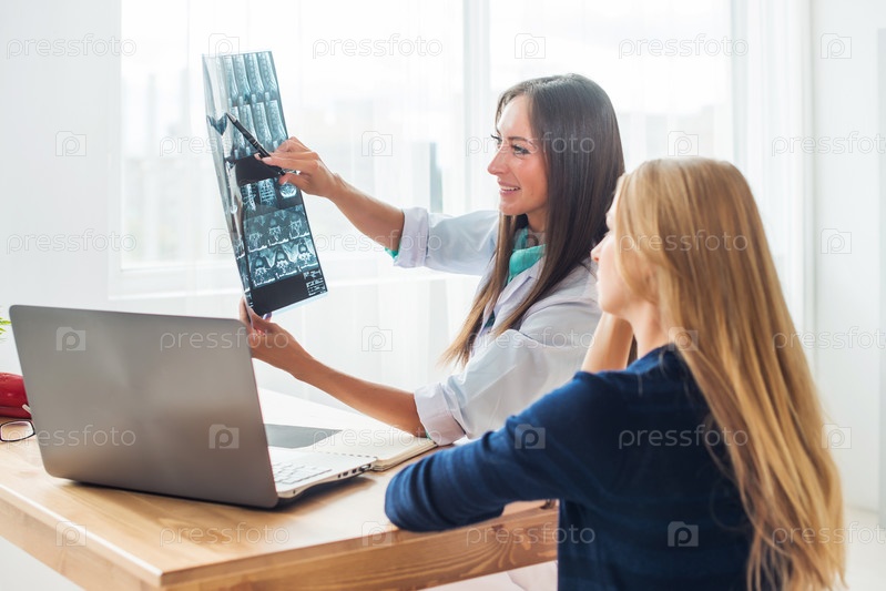 Женщина-врач и пациент, глядя на рентгеновский снимок