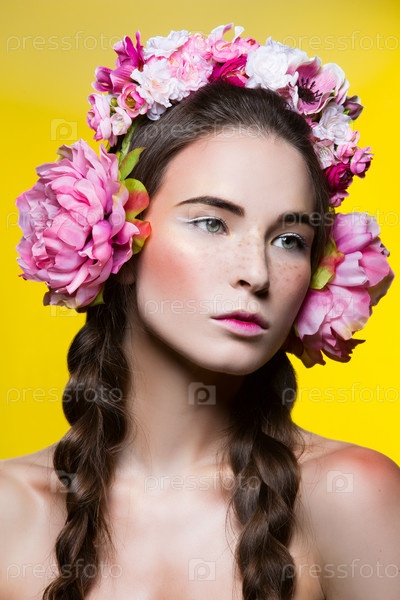 Красивая девушка с цветочными наушниками