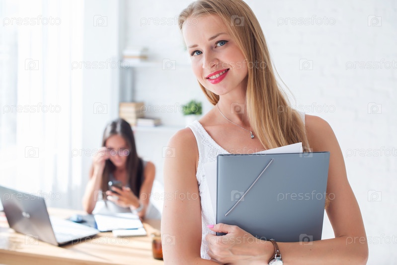 Портрет счастливой улыбающейся деловой женщины с папкой