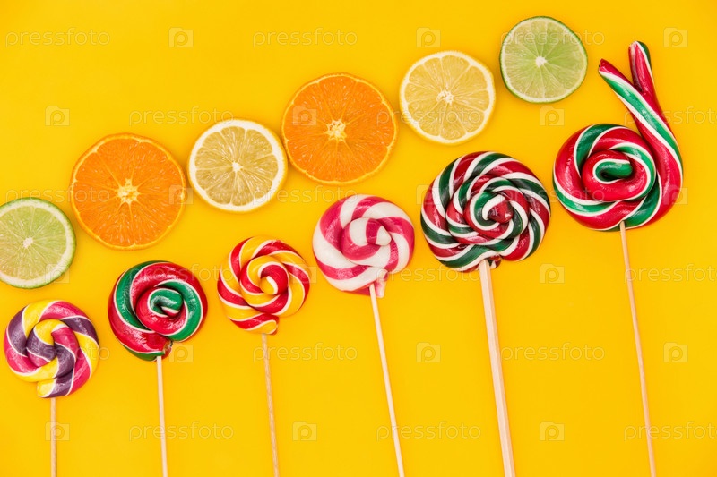 Конфеты и фрукты на желтом фоне
