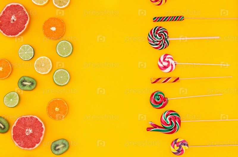 Конфеты и фрукты на желтом фоне