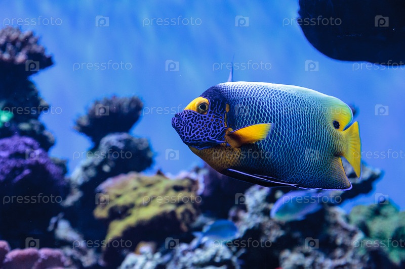 Голубоглазый ангелский помакантусский ксантометопон в коралловом рифе