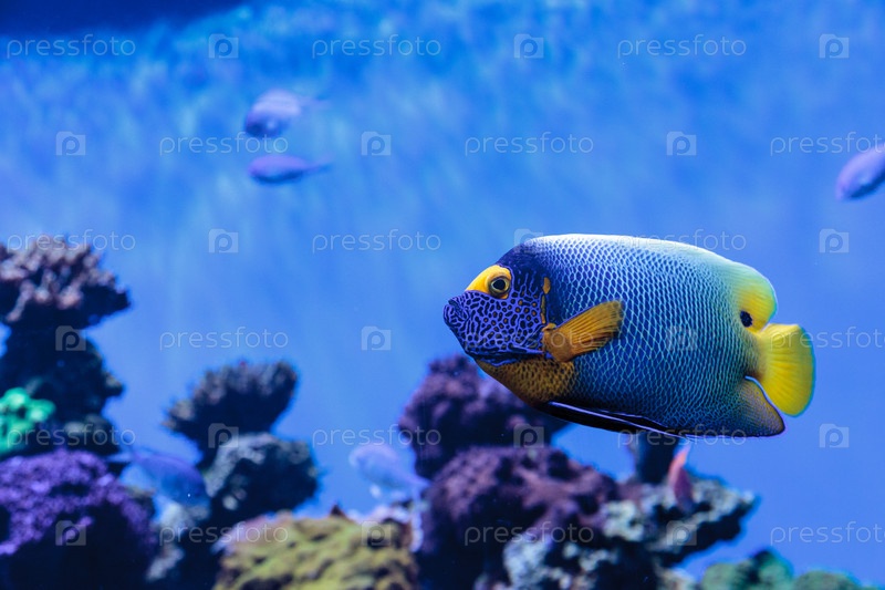 Голубоглазый ангелский помакантусский ксантометопон в коралловом рифе