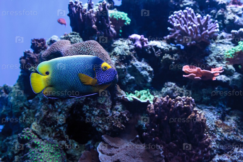 Голубоглазый ангелский помакантусский ксантометопон в коралловом рифе