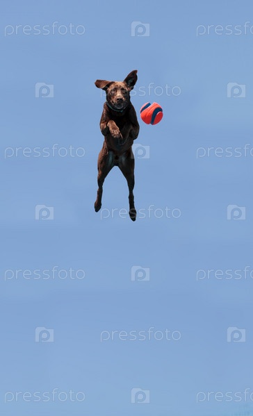 Шоколадный лабрадор ретривер прыгает с игрушкой