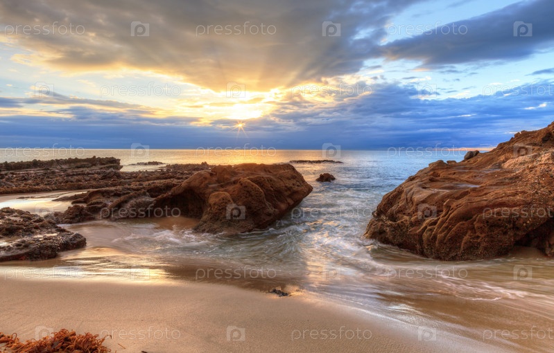Закат над скалами на пляже Перл-Стрит в Лагуна-Бич, Калифорния, США
