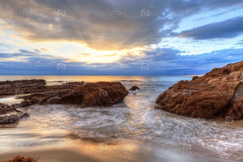 Закат над скалами на пляже Перл-Стрит в Лагуна-Бич, Калифорния, США