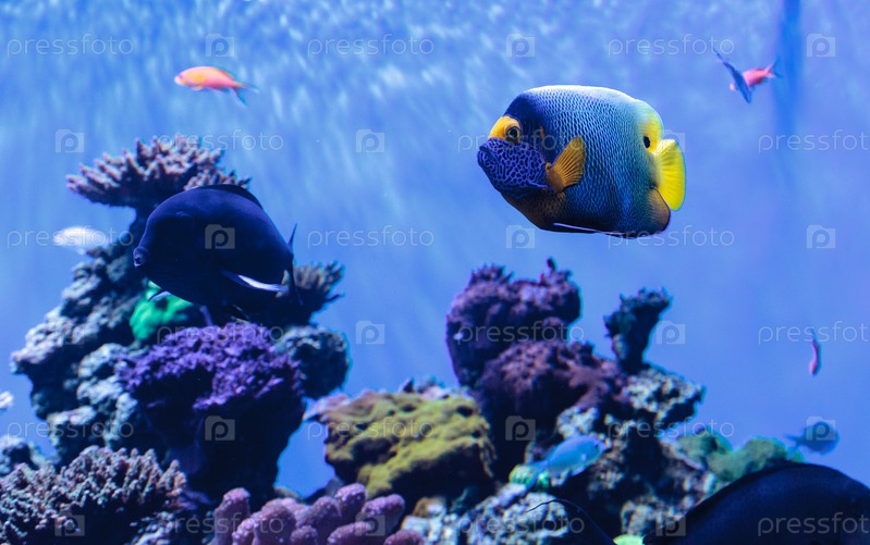 Голубоглазый ангелский помакантусский ксантометопон в коралловом рифе