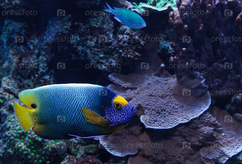 Голубоглазый ангелский помакантусский ксантометопон в коралловом рифе