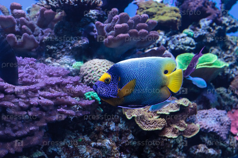 Голубоглазый ангелский помакантусский ксантометопон в коралловом рифе