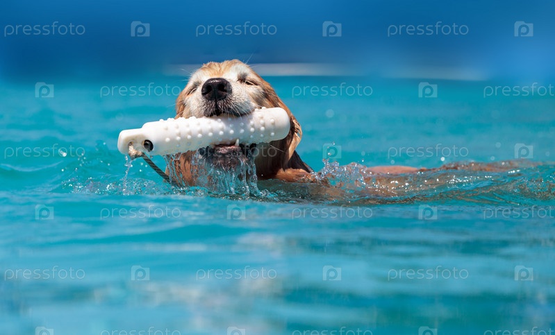 Золотой ретривер плавает с игрушкой