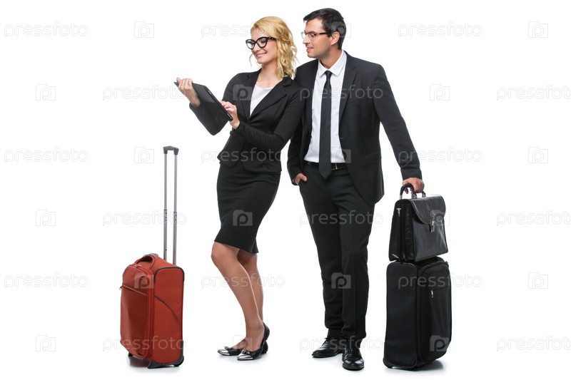 Бизнесмен и деловая женщина с чемоданами