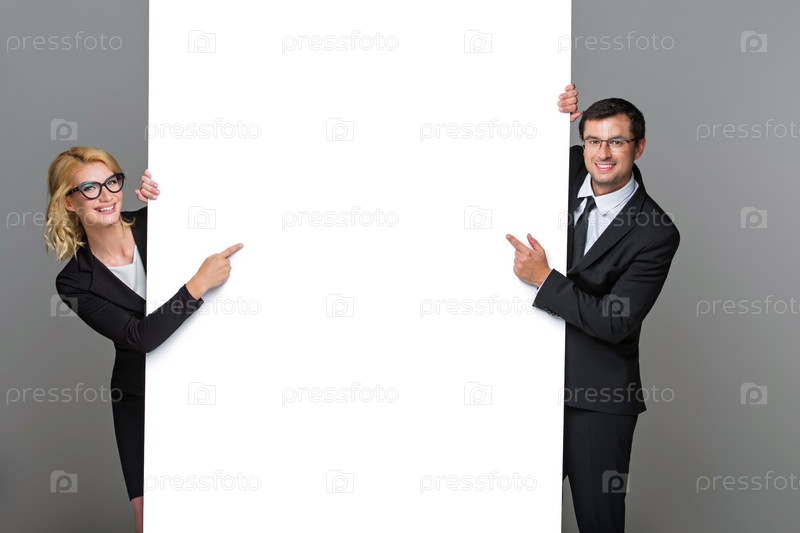 Бизнесмен и бизнес-леди с большим белым плакатом