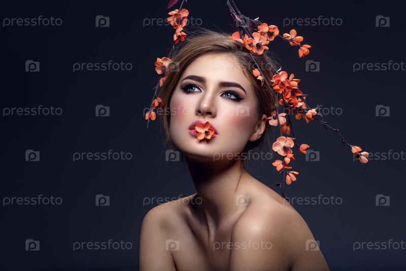 Красивая девушка с веткой сакуры