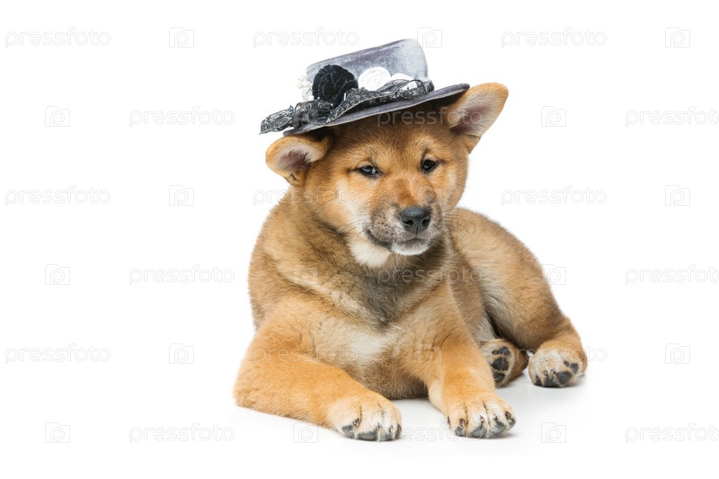 Красивый щенок шиба-ину в серой шляпе