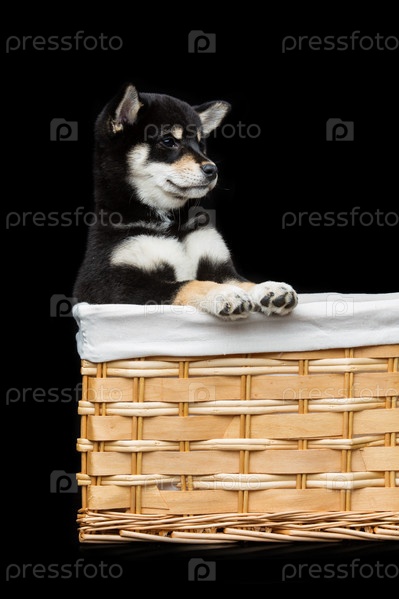 Красивый щенок шиба-ину в корзине