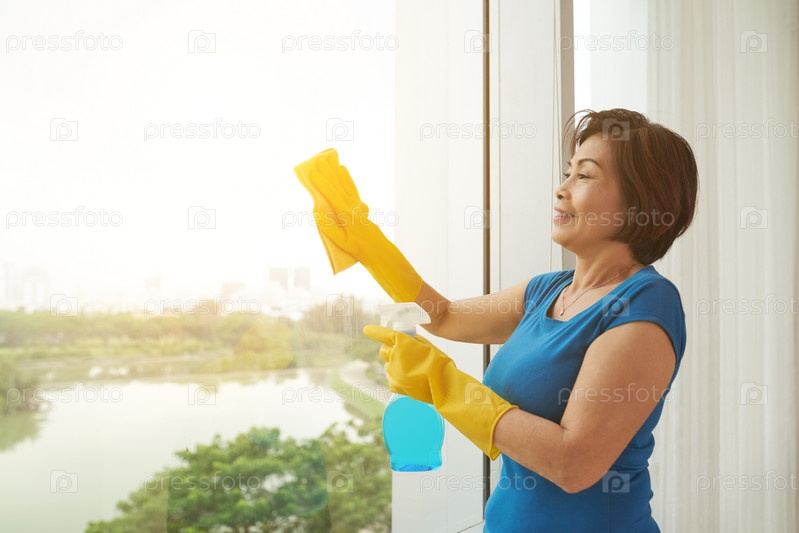 Женщина моет окна