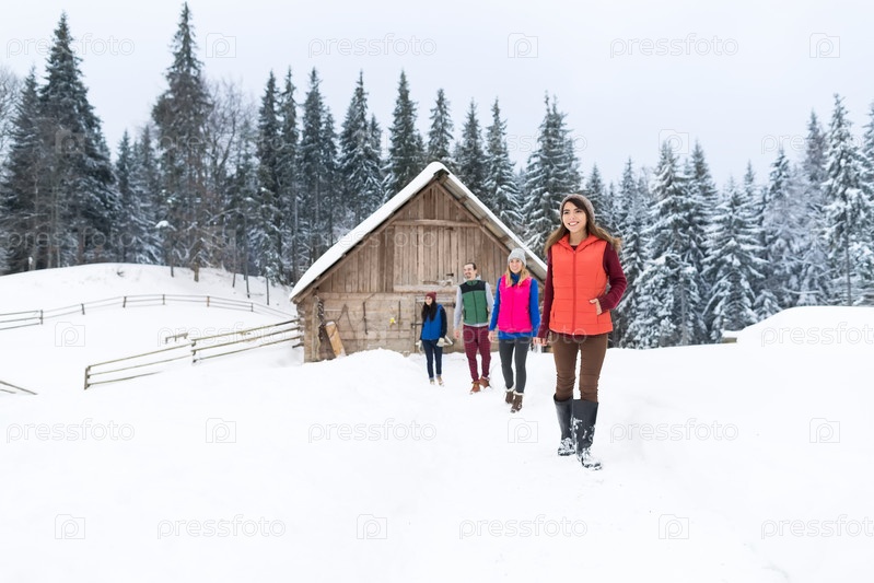 Друзья возле деревянного загородного дома