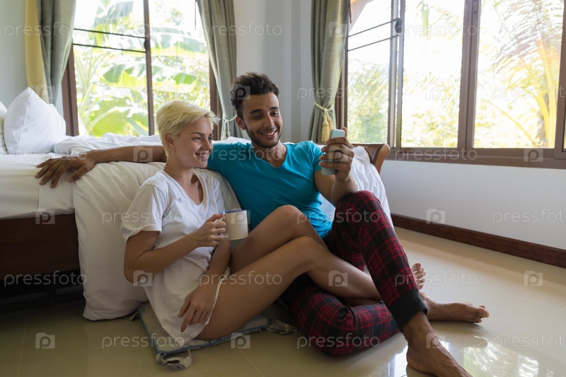 Молодая пара сидит возле кровати