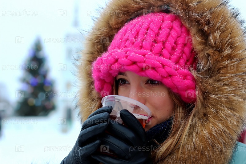 Девушка с напитком в зимнем парке