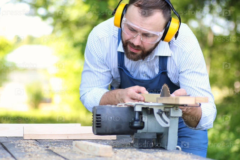 Мужчина пилит доски