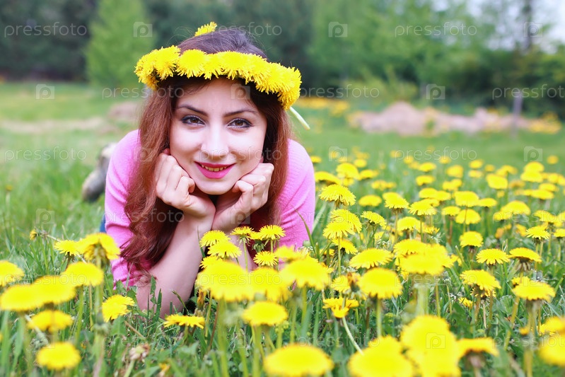 Молодая женщина на лугу с одуванчиками