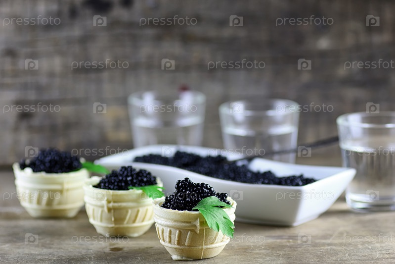 Черная икра и рюмки с водкой