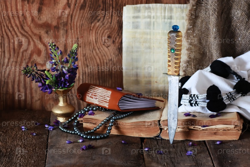 Нож, книга, цветы