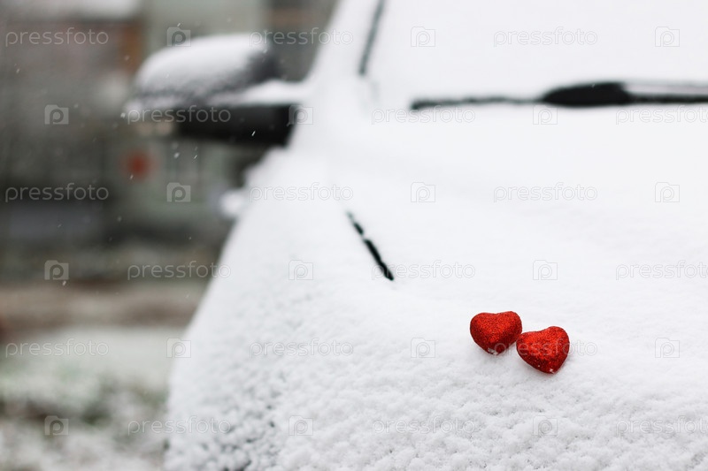 Сердца на заснеженной машине