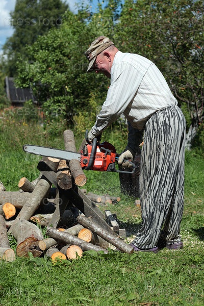 Мужчина пилит дрова
