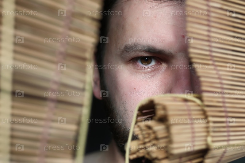 Сердитый человек смотрит через жалюзи