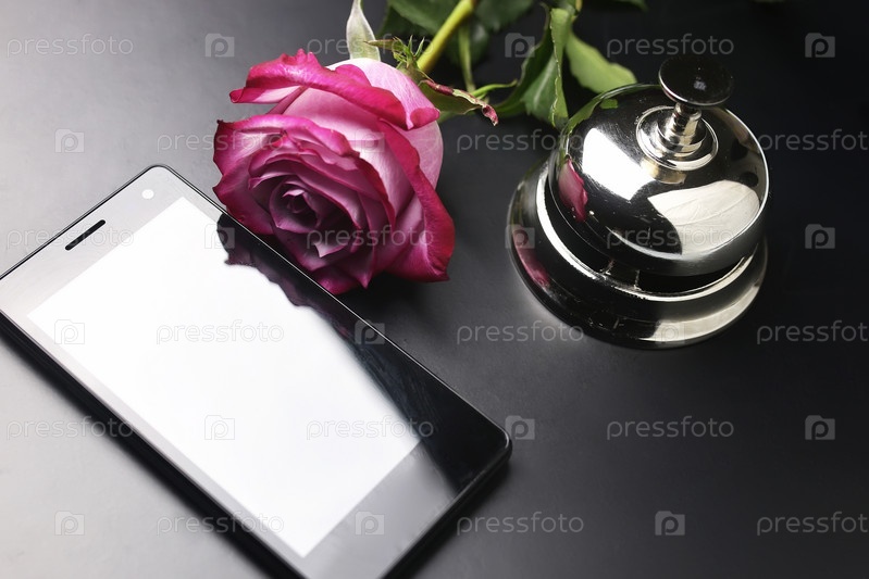 Телефон, роза и звонок на стойке регистрации в отеле