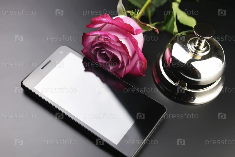 Звонок, роза и телефон на стойке регистрации в отеле