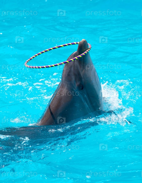 Дельфин с обручем в голубой воде