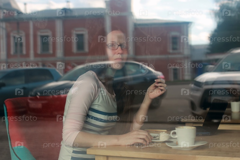 Девушка за стеклом в кафе