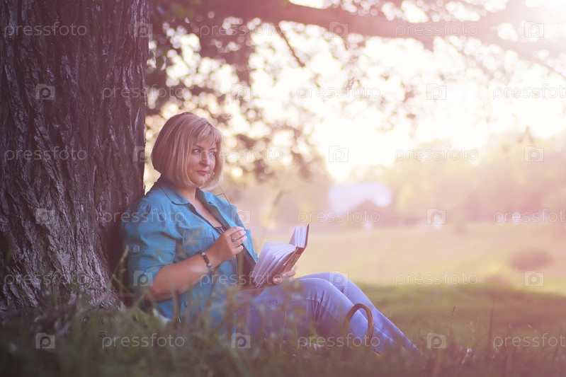 Женщина в парке на закате с книгой