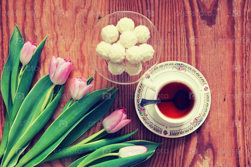 Фон деревянный с тюльпаном и чаем