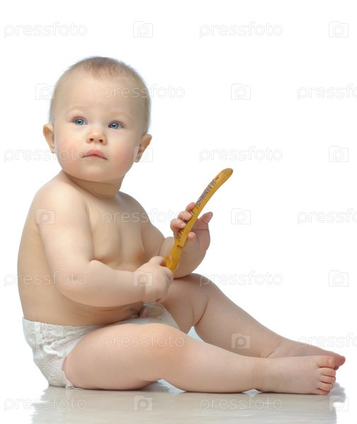 Малыш с деревянной ложкой сидит на белом фоне