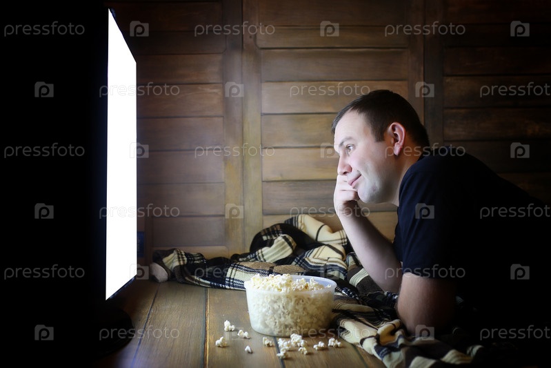 Молодой человек смотрит телевизор дома на полу