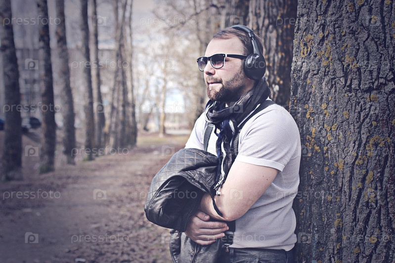 Мужчина в парке в наушниках