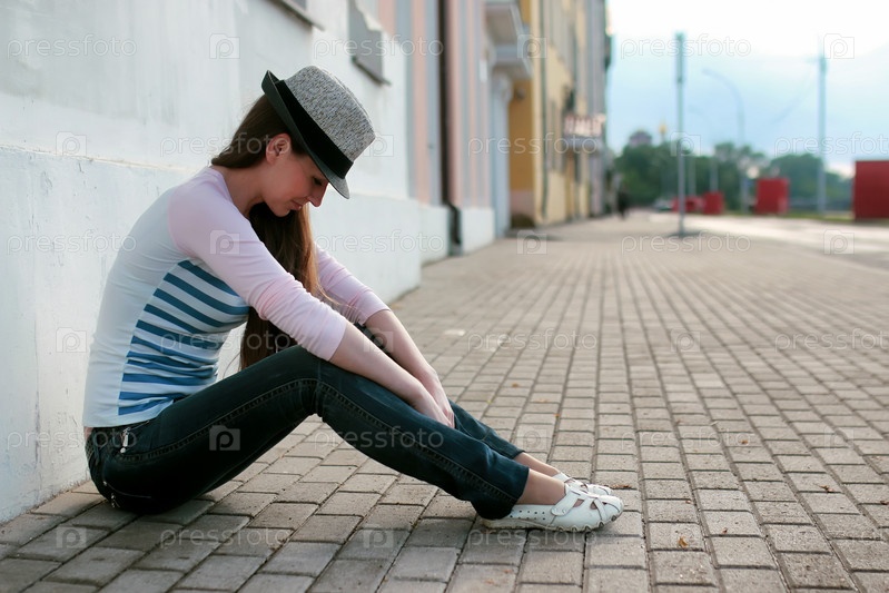 Девушка сидит на тротуаре