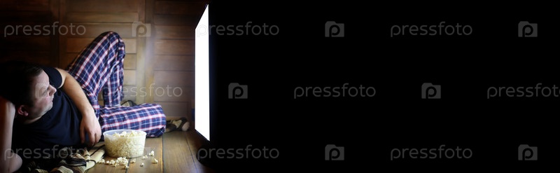 Мужчина смотрит телевизор дома на полу