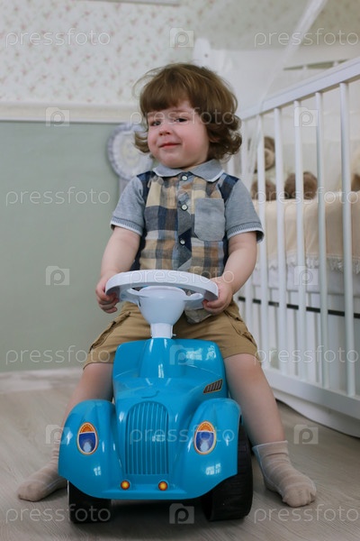Мальчик сидит на игрушечной машине