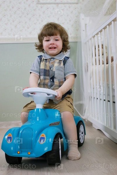 Мальчик сидит на игрушечной машине